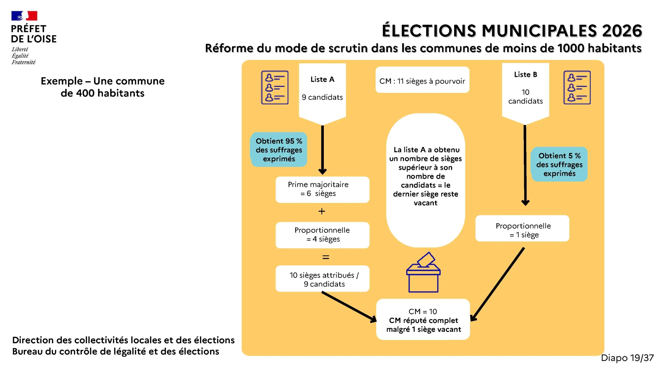 - Rédaction d’un procès-verbal en deux exemplaires originaux (l’un des deux restes en mairie), accompagné des bulletins blancs et nuls, d’un exemplaire du bulletin de vote de chacune des listes, la feuille de proclamation des résultats et le tableau du conseil municipal. > À remettre en préfecture au maximum à 18 heures le premier lundi suivant l’élection.
